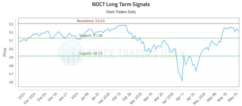 The technical summary data tells us to buy NOCT near 51.28 with an upside target of 53.03. This data also tells us to set a stop loss @ 51.13 to protect against excessive loss in case the stock begins to move against the trade. 51.28 is the first level of support below 52.0289 , and by rule, any test of support is a buy signal. In this case, support 51.28 is being tested, a buy signal would exist.