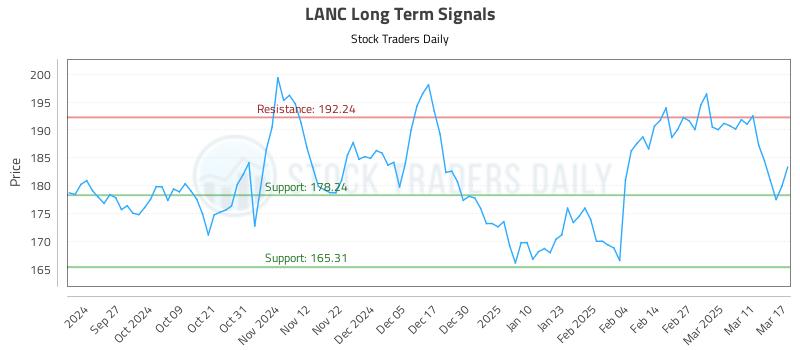 The technical summary data tells us to buy LANC near 178.24 with an upside target of 192.24. This data also tells us to set a stop loss @ 177.73 to protect against excessive loss in case the stock begins to move against the trade. 178.24 is the first level of support below 183.21 , and by rule, any test of support is a buy signal. In this case, support 178.24 is being tested, a buy signal would exist.