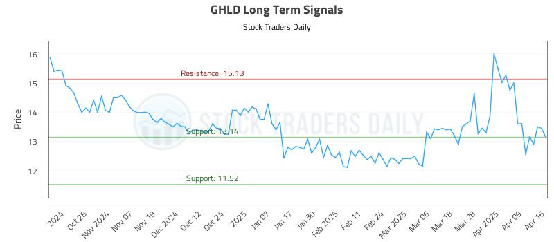 The technical summary data tells us to buy GHLD near 13.14 with an upside target of 15.13. This data also tells us to set a stop loss @ 13.1 to protect against excessive loss in case the stock begins to move against the trade. 13.14 is the first level of support below 13.16 , and by rule, any test of support is a buy signal. In this case, support 13.14 is being tested, a buy signal would exist.