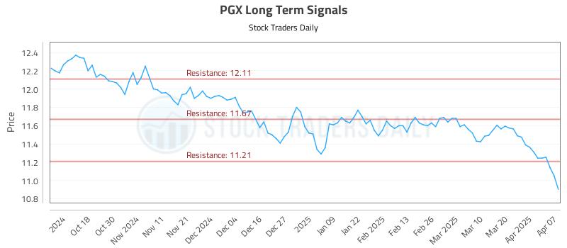 The technical summary data is suggesting a short of PGX as it gets near 11.21, but the downside target is not available from the current data. This tells us to hold that position if it is triggered until a new downside target has been established (updates occur at the beginning of every trading session) or until the position has been stopped. The summary data tells us to have a stop loss in place at 11.24. 11.21 is the first level of resistance above 10.94, and by rule, any test of resistance is a short signal. In this case, if resistance 11.21 is being tested, so a short signal would exist.