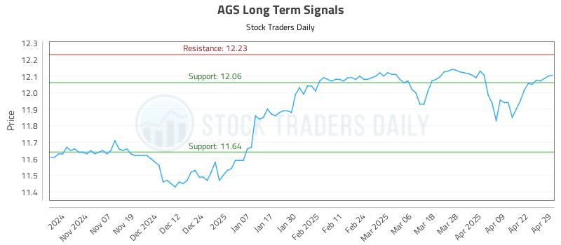 • The technical summary data tells us to buy AGS near 11.64 with an upside target of 12.23. This data also tells us to set a stop loss @ 11.61 to protect against excessive loss in case the stock begins to move against the trade. 11.64 is the first level of support below 12.11 , and by rule, any test of support is a buy signal. In this case, support 11.64 would be being tested, so a buy signal would exist.
