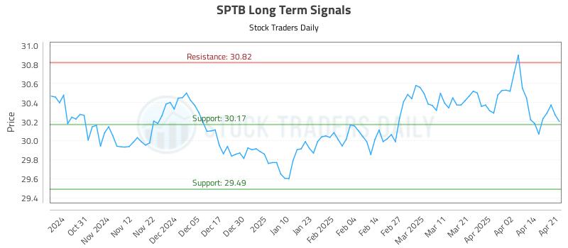 The technical summary data tells us to buy SPTB near 30.17 with an upside target of 30.82. This data also tells us to set a stop loss @ 30.08 to protect against excessive loss in case the stock begins to move against the trade. 30.17 is the first level of support below 30.1949 , and by rule, any test of support is a buy signal. In this case, support 30.17 is being tested, a buy signal would exist.