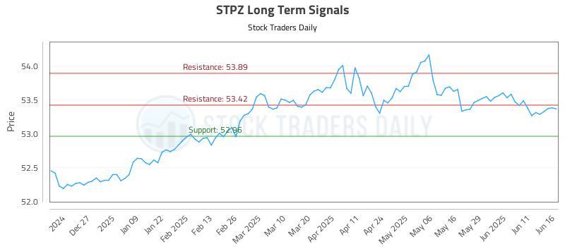 The technical summary data tells us to buy STPZ near 52.96 with an upside target of 53.42. This data also tells us to set a stop loss @ 52.81 to protect against excessive loss in case the stock begins to move against the trade. 52.96 is the first level of support below 53.38 , and by rule, any test of support is a buy signal. In this case, support 52.96 would be being tested, so a buy signal would exist.
