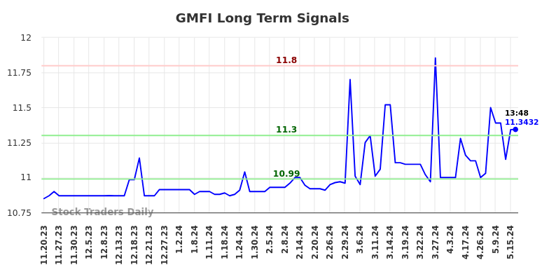 The technical summary data tells us to buy GMFI near 11.3 with an upside target of 11.8. This data also tells us to set a stop loss @ 11.27 to protect against excessive loss in case the stock begins to move against the trade. 11.3 is the first level of support below 11.3432 , and by rule, any test of support is a buy signal. In this case, support 11.3 is being tested, a buy signal would exist.