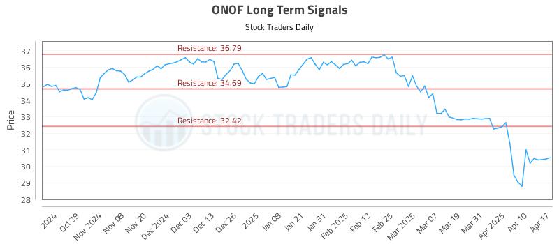 The technical summary data is suggesting a short of ONOF as it gets near 32.42, but the downside target is not available from the current data. This tells us to hold that position if it is triggered until a new downside target has been established (updates occur at the beginning of every trading session) or until the position has been stopped. The summary data tells us to have a stop loss in place at 32.51. 32.42 is the first level of resistance above 30.495, and by rule, any test of resistance is a short signal. In this case, if resistance 32.42 is being tested, so a short signal would exist.