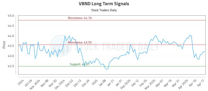• The technical summary data tells us to buy VBND near 42.47 with an upside target of 43.55. This data also tells us to set a stop loss @ 42.35 to protect against excessive loss in case the stock begins to move against the trade. 42.47 is the first level of support below 43.11 , and by rule, any test of support is a buy signal. In this case, support 42.47 would be being tested, so a buy signal would exist.
