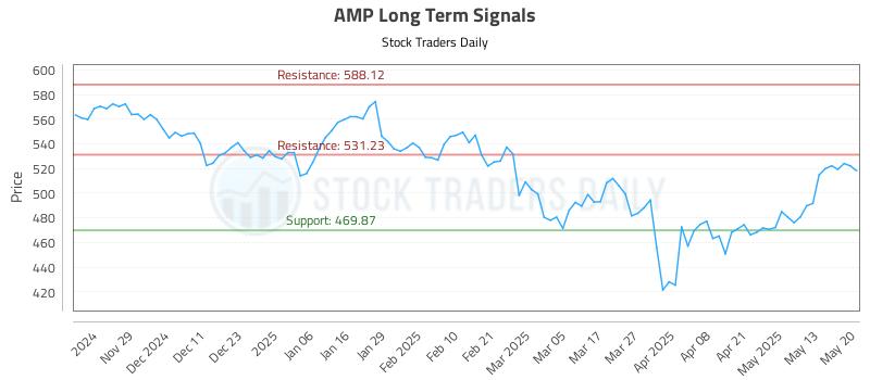 The technical summary data tells us to buy AMP near 469.87 with an upside target of 531.23. This data also tells us to set a stop loss @ 468.51 to protect against excessive loss in case the stock begins to move against the trade. 469.87 is the first level of support below 518.89 , and by rule, any test of support is a buy signal. In this case, support 469.87 would be being tested, so a buy signal would exist.