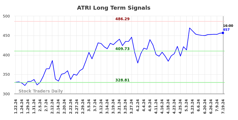 The technical summary data tells us to buy ATRI near 409.73 with an upside target of 486.29. This data also tells us to set a stop loss @ 408.55 to protect against excessive loss in case the stock begins to move against the trade. 409.73 is the first level of support below 457 , and by rule, any test of support is a buy signal. In this case, support 409.73 is being tested, a buy signal would exist.