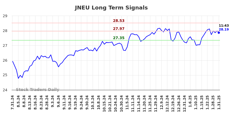 The technical summary data tells us to buy JNEU near 27.35 with an upside target of 27.98. This data also tells us to set a stop loss @ 27.27 to protect against excessive loss in case the stock begins to move against the trade. 27.35 is the first level of support below 27.8673 , and by rule, any test of support is a buy signal. In this case, support 27.35 would be being tested, so a buy signal would exist.