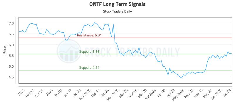 • The technical summary data tells us to buy ONTF near 5.56 with an upside target of 6.31. This data also tells us to set a stop loss @ 5.54 to protect against excessive loss in case the stock begins to move against the trade. 5.56 is the first level of support below 5.6 , and by rule, any test of support is a buy signal. In this case, support 5.56 is being tested, a buy signal would exist.